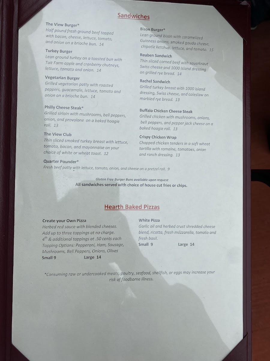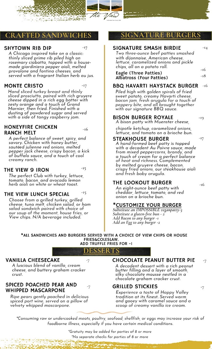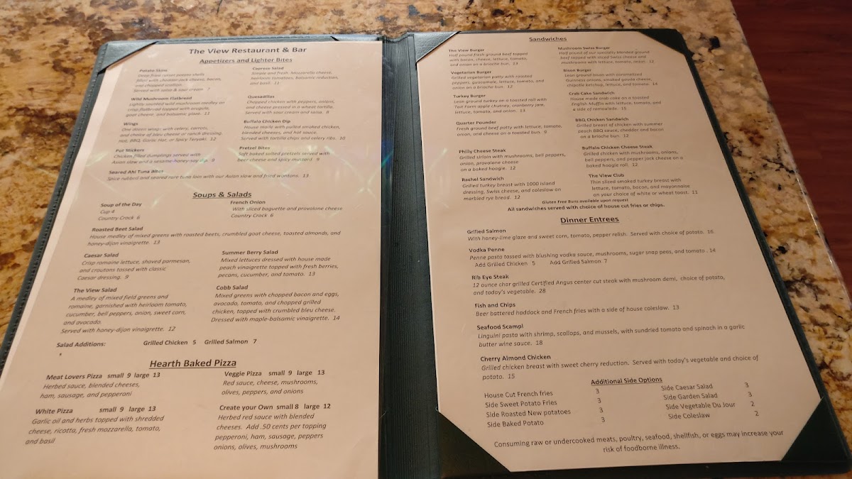 The View Restaurant & Bar invites diners to a delightful culinary experience set against breathtaking vistas. Located in Boalsburg, PA, this eatery boasts an inviting atmosphere complemented by a great outdoor dining area. The menu offers a diverse lineup, starting with tempting appetizers like wild mushroom flatbread and seared ahi tuna bites. The signature burgers are a highlight, featuring the BBQ Havarti Haystack at $16 and the hearty Bison Burger Royale. For those craving a sandwich, the Honeyfire Chicken Ranch Melt is a must-try at $16. Customers rave about the warm and attentive service, bringing a homely feel to each visit. Guests like Kathy-Ann passionately praise unforgettable birthday celebrations, while others applaud the daily specials and thoughtful menu recommendations, ensuring a memorable dining experience. The combination of flavorful dishes and an attentive staff creates a welcoming ambiance that beckons for repeat visits.